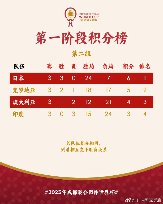 问鼎娱乐北京时间12月3日消息,2025年成都国际乒联混合团体世界杯继续进行。第一组小组循环赛第三轮,中国队以8-0战胜智利队,3连胜小组第一晋级。另一场焦点比赛中,日本队以8-2战胜克罗地亚队,张本智和在比赛中丢掉一局,此前与澳大利亚的比赛中,张本智和丢掉全队唯一一局。